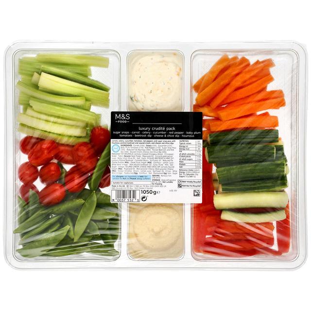 A luxury pack of sweet and crunchy crudités, including sugar snaps, carrots, celery, cucumber, red pepper and baby plum tomatoes. Served with a smooth beetroot dip, creamy cheese and chive dip and houmous. Serves 6-8.
